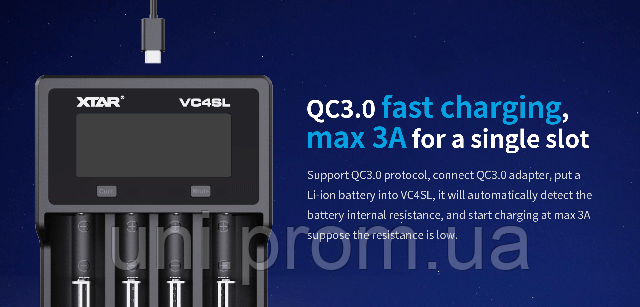 XTAR VC4SL — це розумний зарядний пристрій із кольоровим LCD-дисплеєм, функцією тестування ємності акумуляторів, режимом для зберігання акумуляторів і швидким QC3.0 заряджанням струмом до 3 А.